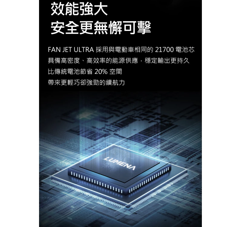 🔹FANJET ULTRA 採用與電動車相同的21700電池芯,具備高密度、高效率的能源供應,穩定輸出更持久