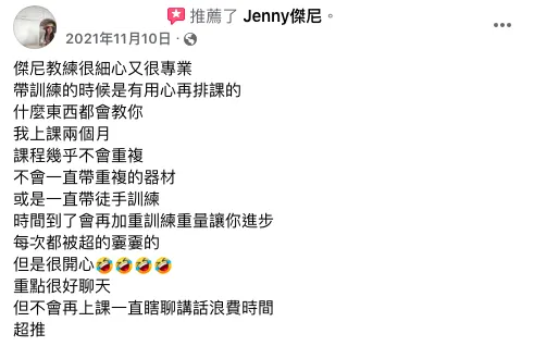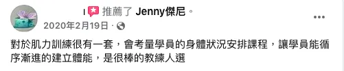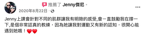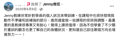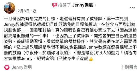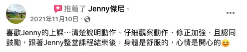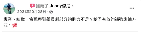![]() ![]() | 如果您從未嘗試過與教練面對面的指導,歡迎預約體驗,感受動作被調整後的差異,Jenny私人教練會為您提供專業的指導和個人化的計劃。 |