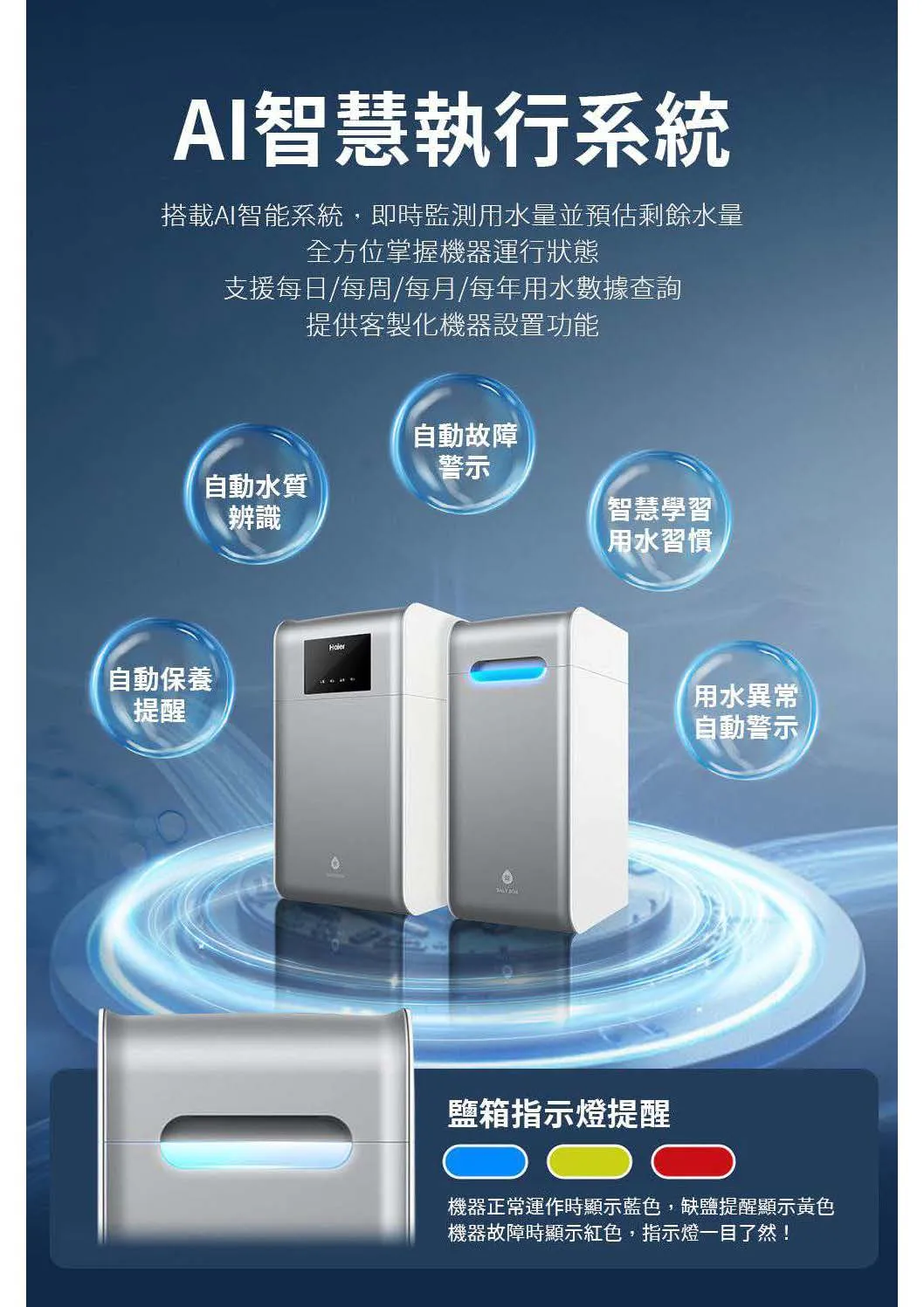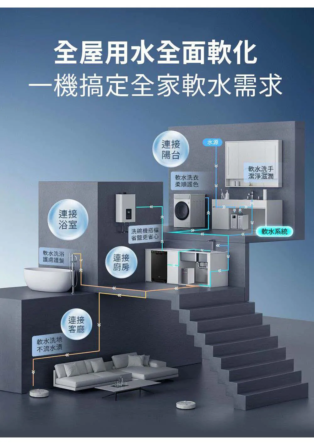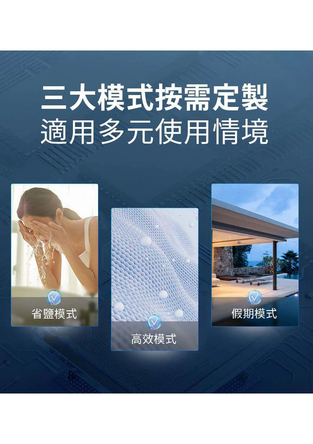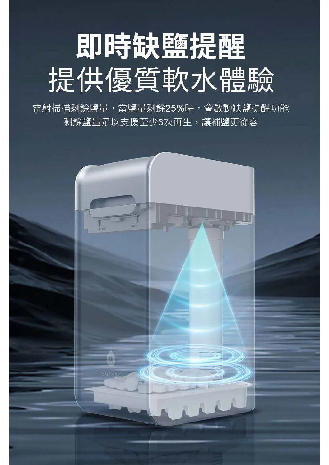 • 即時缺鹽提醒: 剩餘鹽量足以支援至少3次再生,補鹽更從容