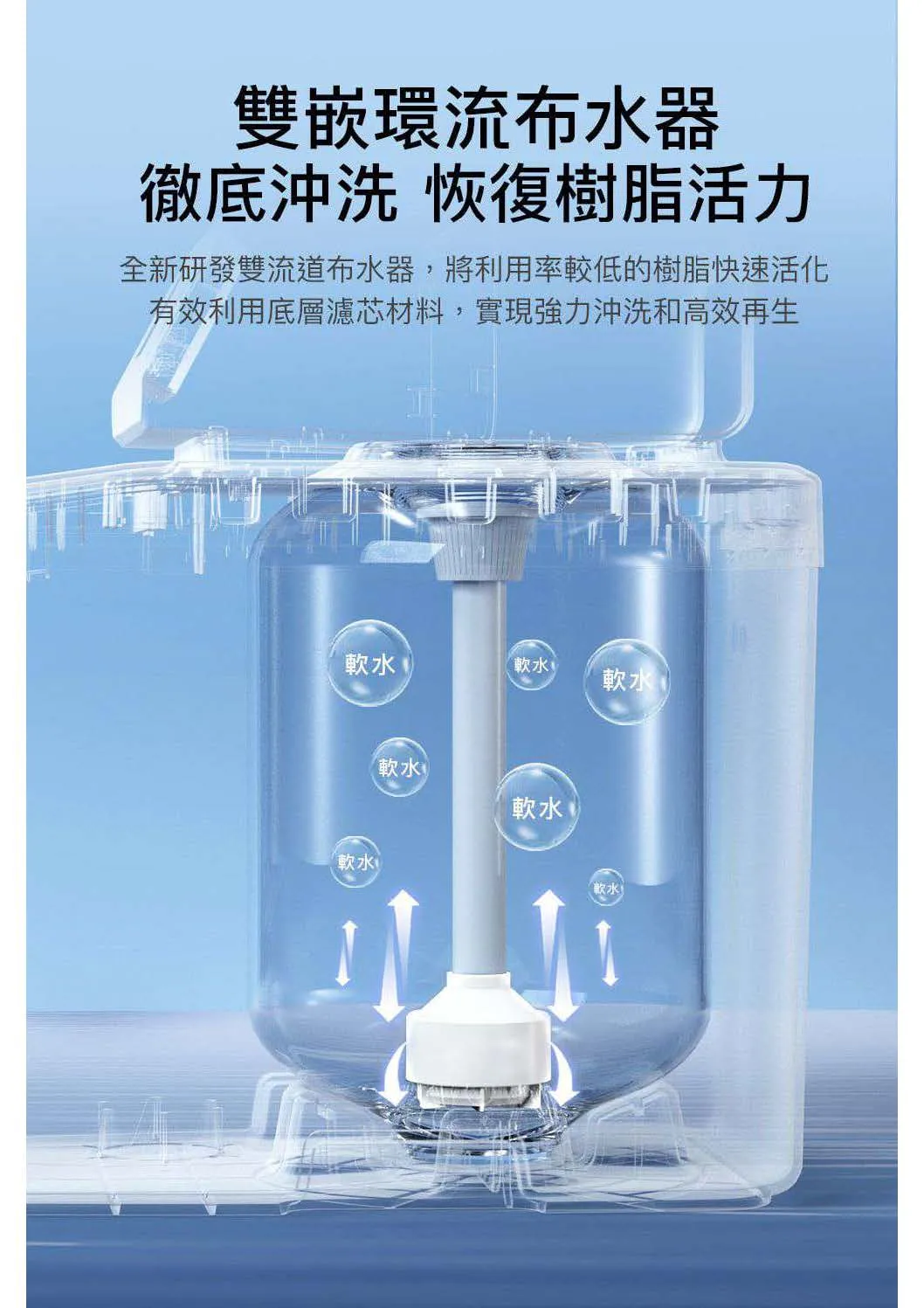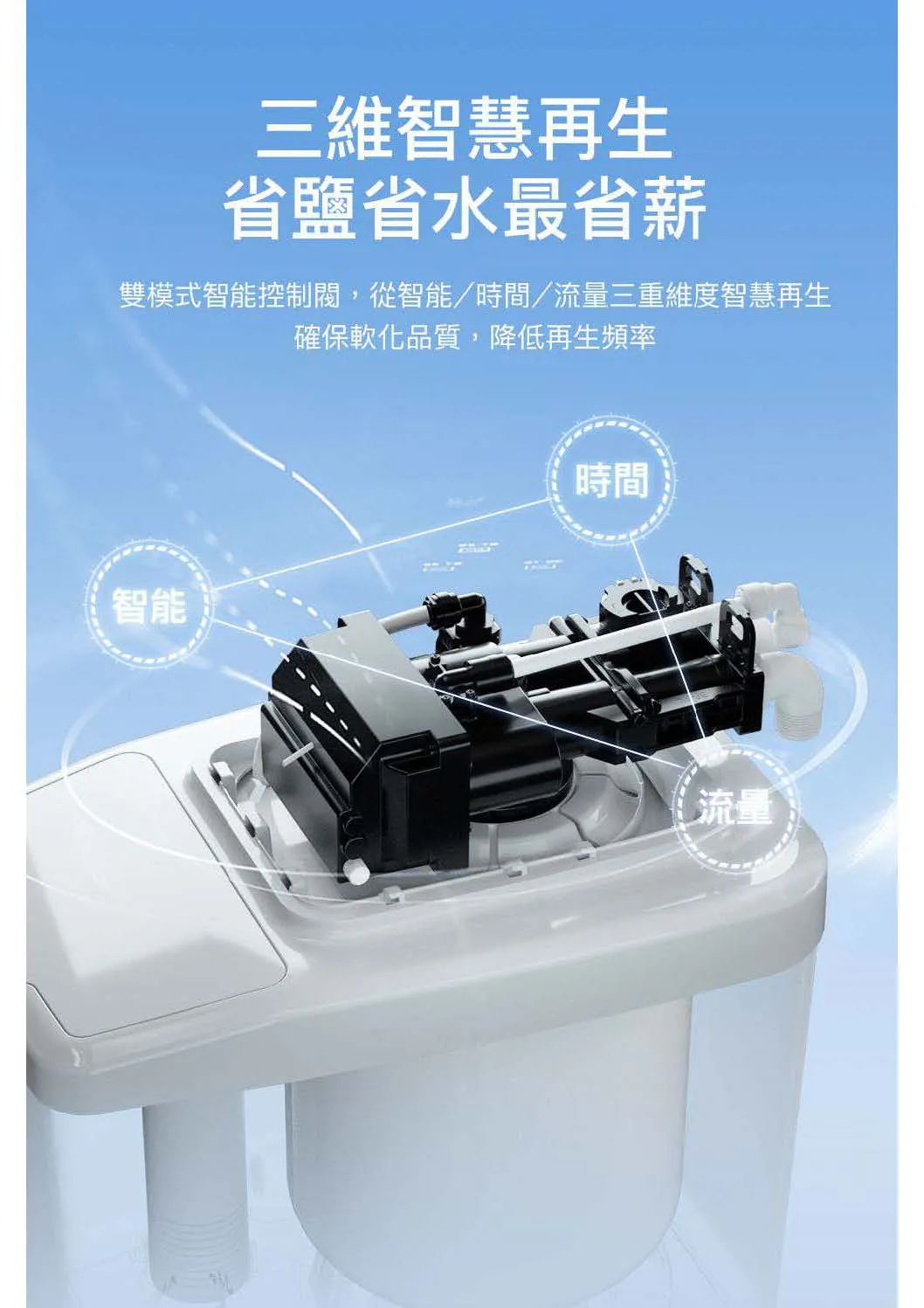 • 雙模式智慧再生技術:降低樹脂再生頻率,耗水量更低