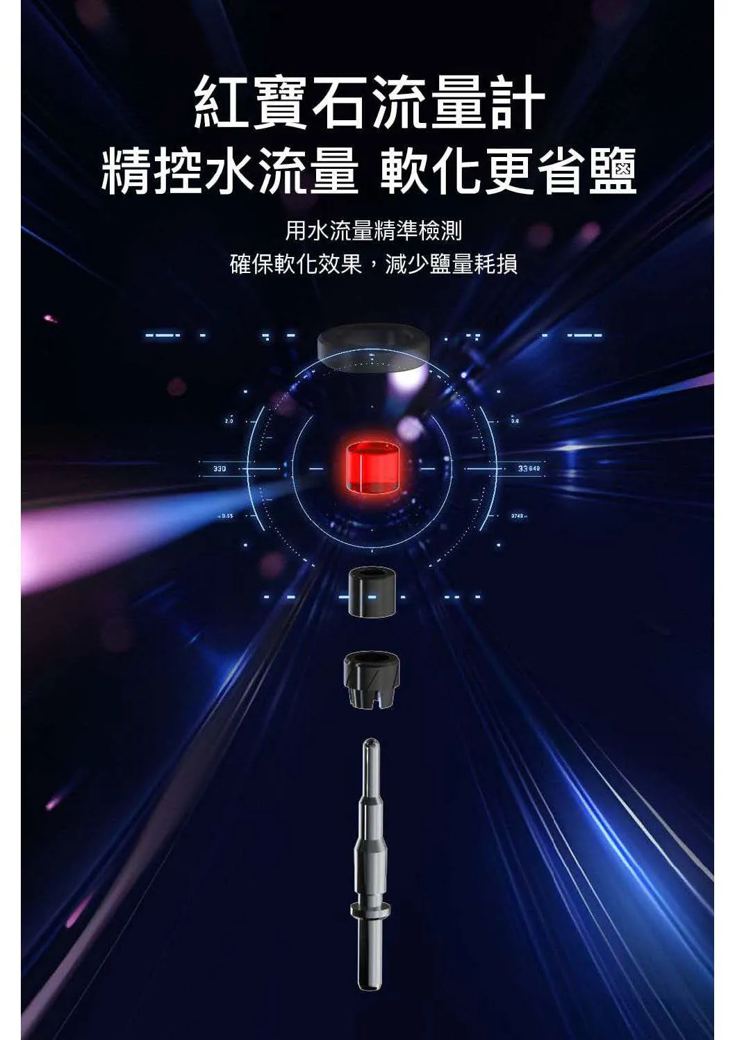 • 紅寶石流量計:精控用水量,確保軟化效果並減少鹽耗