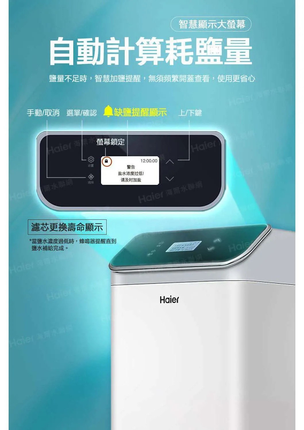 • 智慧加鹽提醒: 智慧顯示大螢幕,自動計算耗鹽量