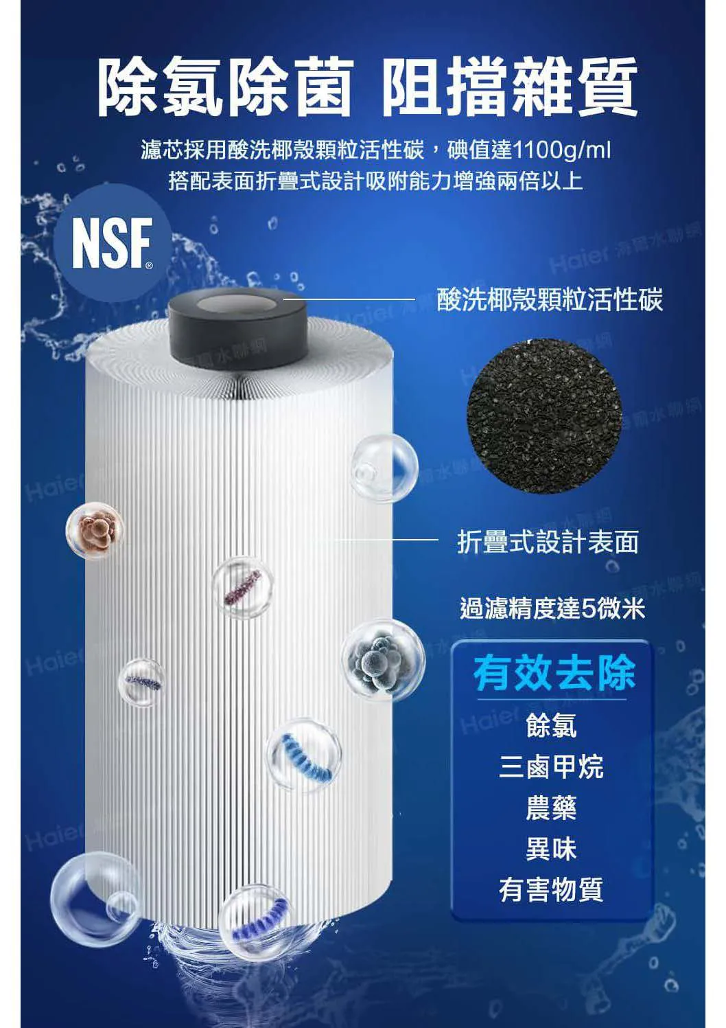 • 活性碳複合式濾芯:採用酸洗椰殼顆粒活性碳+表面折疊式設計,吸附力增強2倍以上