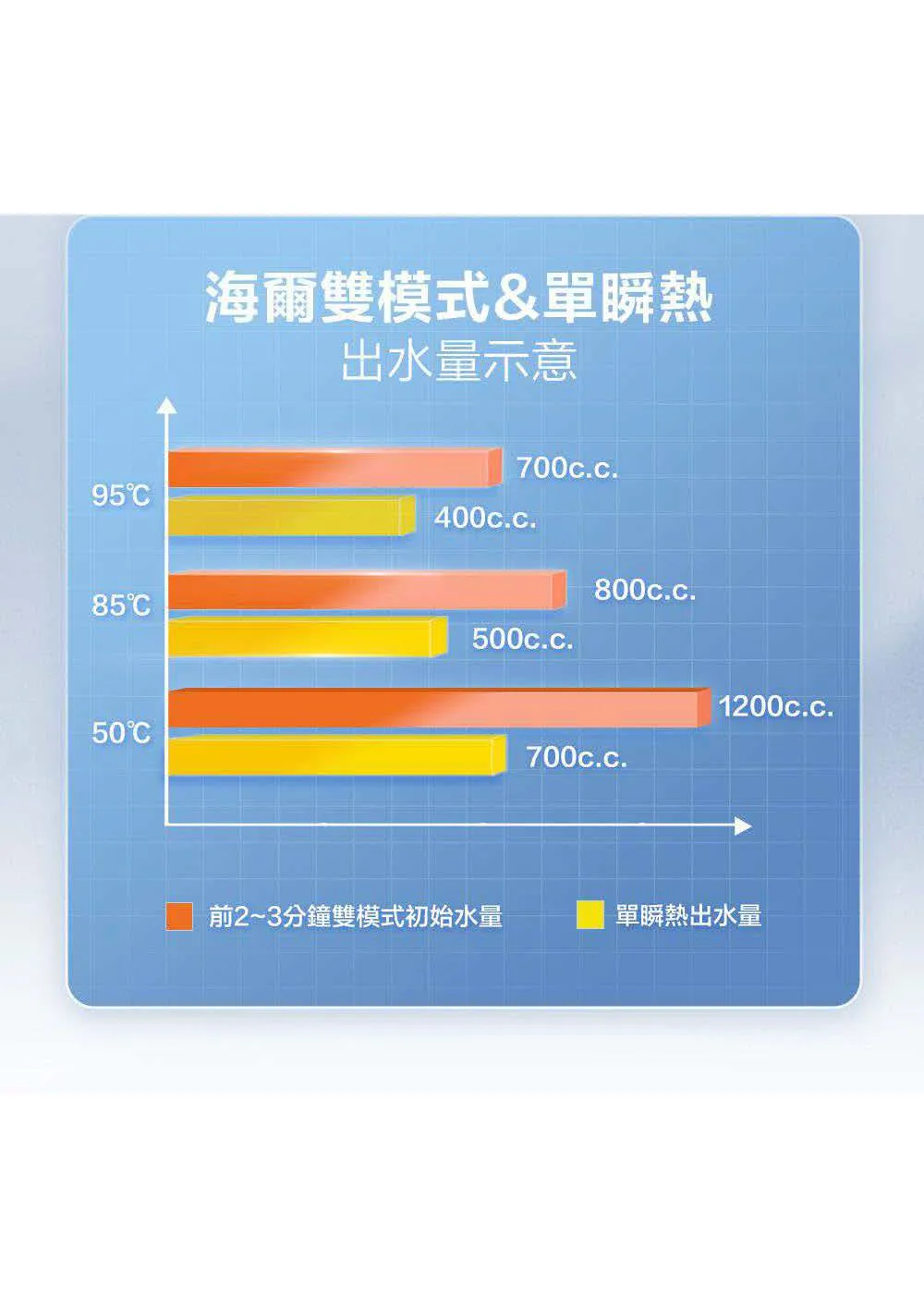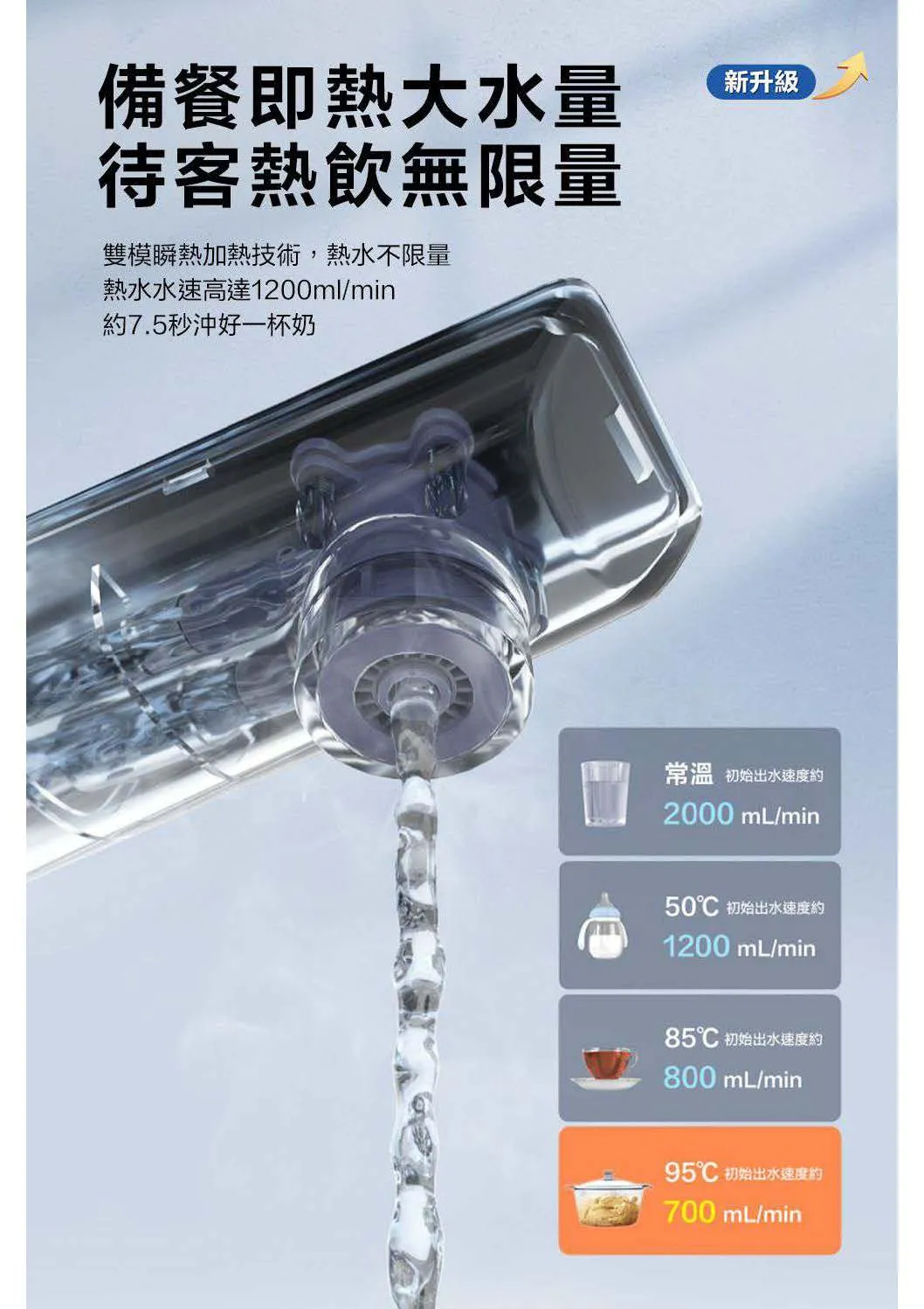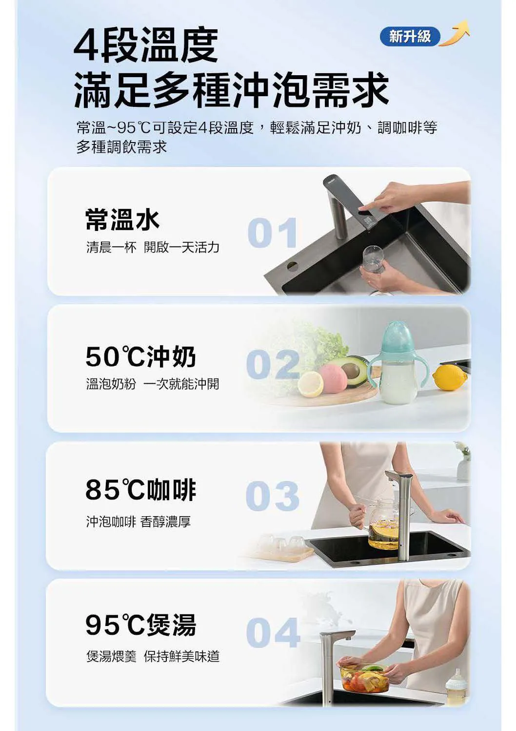 • 變頻厚膜瞬熱:4段常溫水到95℃熱水設定,滿足多種用水需求