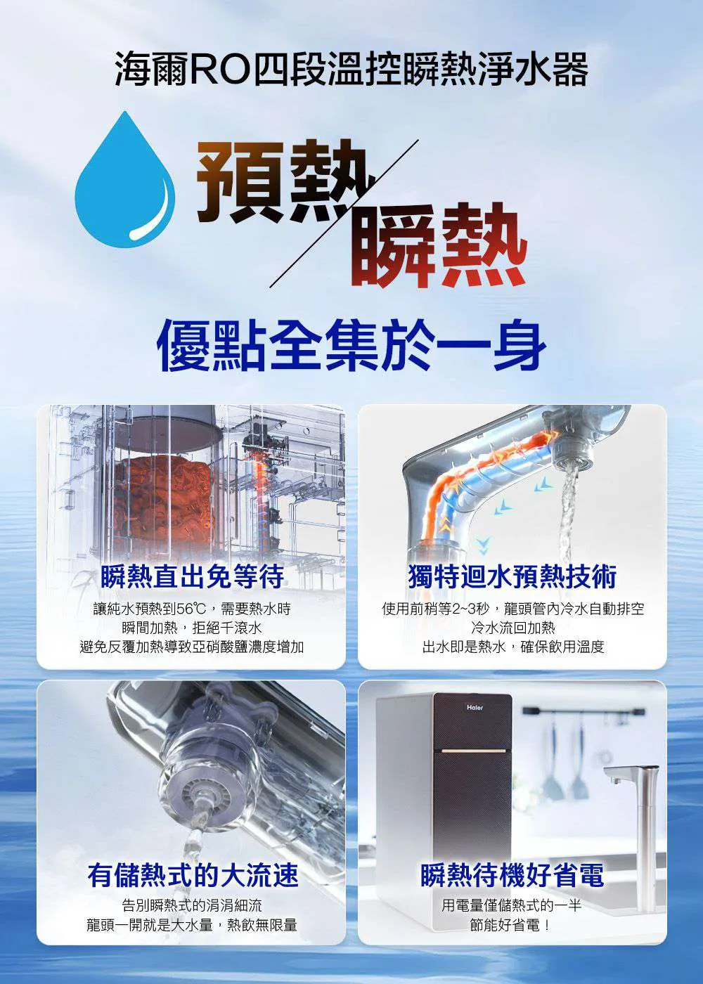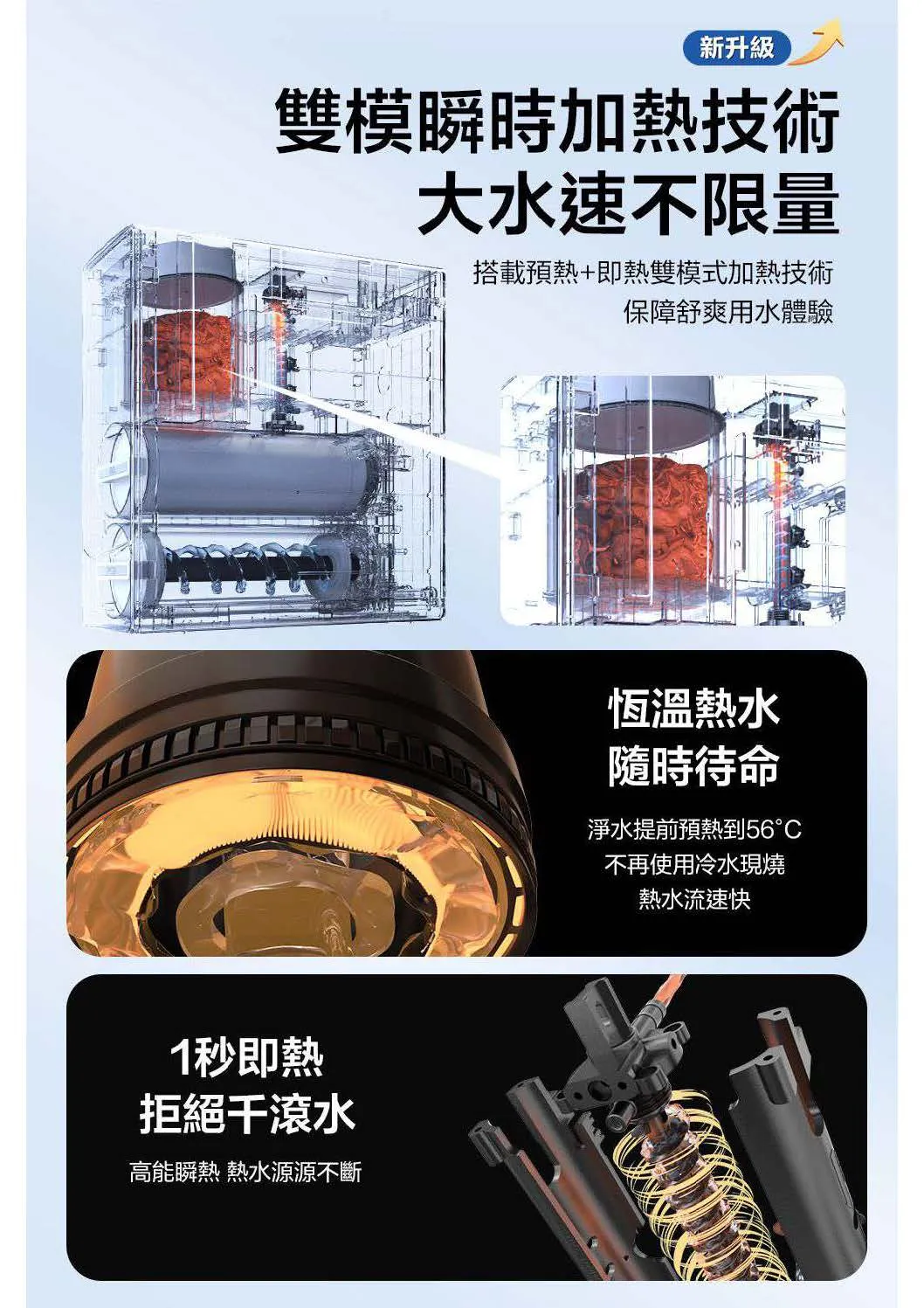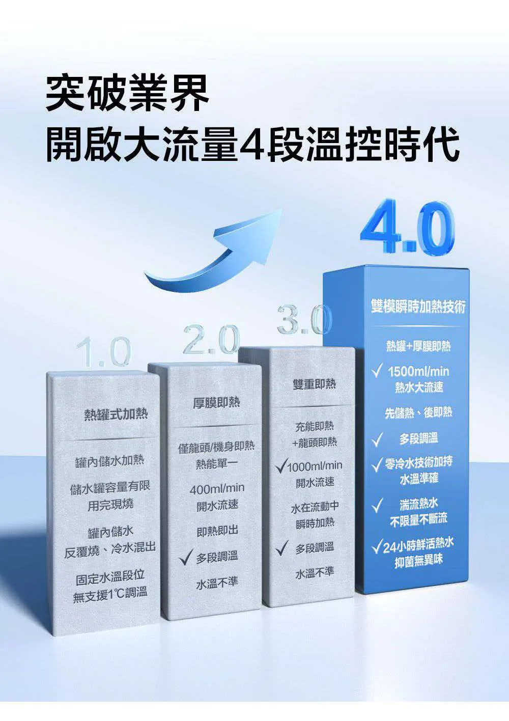 • 變頻厚膜瞬熱:4段常溫水到95℃熱水設定,滿足多種用水需求