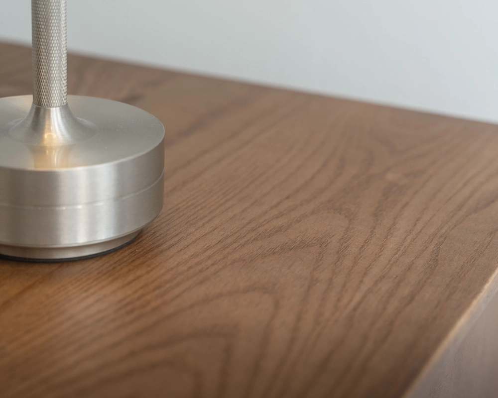木質表面以清漆保護,微霧光澤柔和,杯痕、灰塵、日常水漬都能輕鬆擦去。