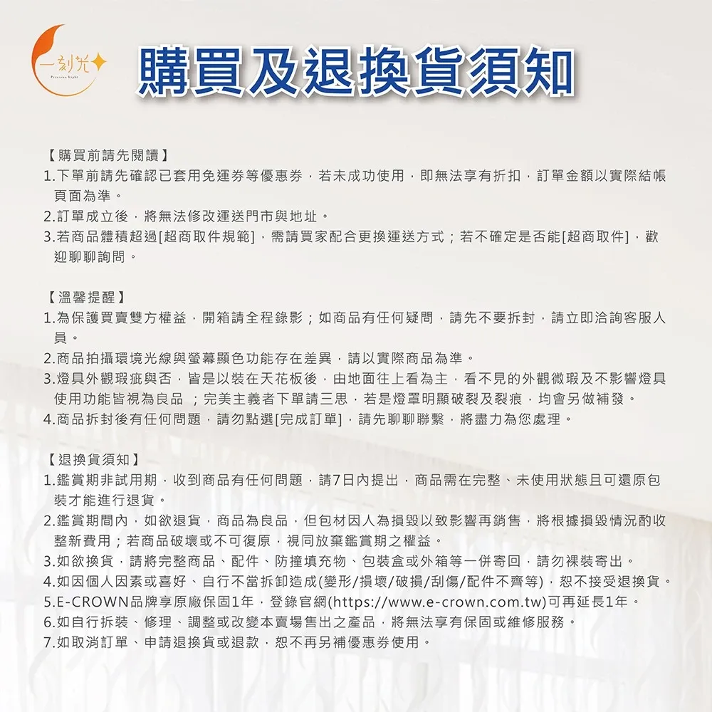 3.燈具外觀瑕疵與否,皆是以裝在天花板後,由地面往上看為主,看不見的外觀微瑕及不影響燈具使用功能皆視為良品 ;完美主義者下單請三思,若是燈罩明顯破裂及裂痕,均會另做補發。
