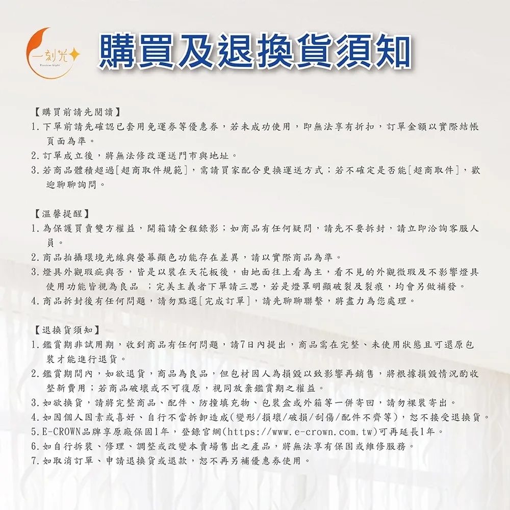 3.燈具外觀瑕疵與否,皆是以裝在天花板後,由地面往上看為主,看不見的外觀微瑕及不影響燈具使用功能皆視為良品 ;完美主義者下單請三思,若是燈罩明顯破裂及裂痕,均會另做補發。
