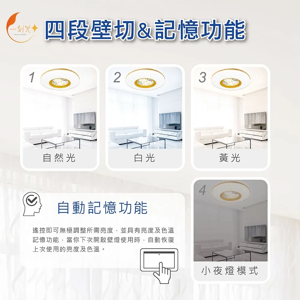 ✨四段壁切+記憶功能→壁切即可快速切換模式,自然光>白光>黃光>夜燈(循環)