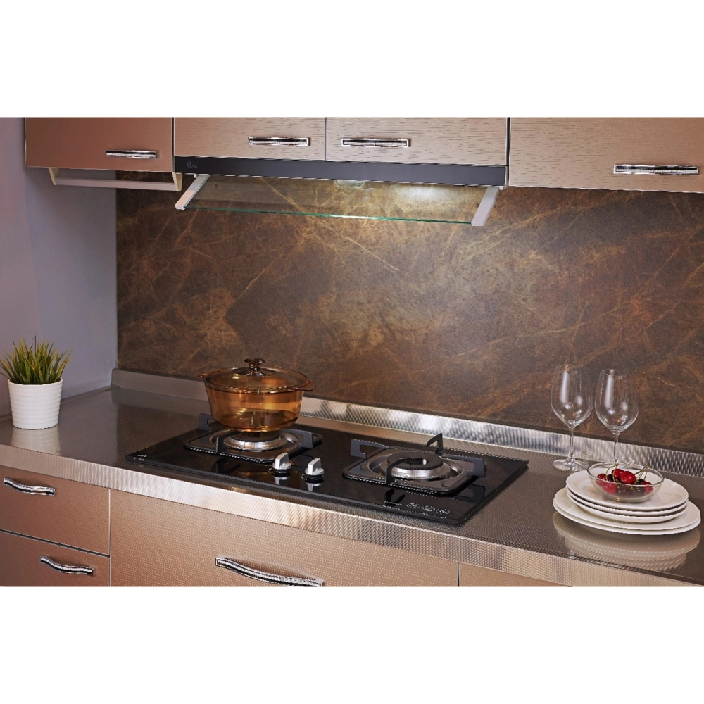 • .翹翹板按壓式強化玻璃擋煙板,輕鬆推拉使用; 擋煙板未使用時完全隱藏,不佔空間