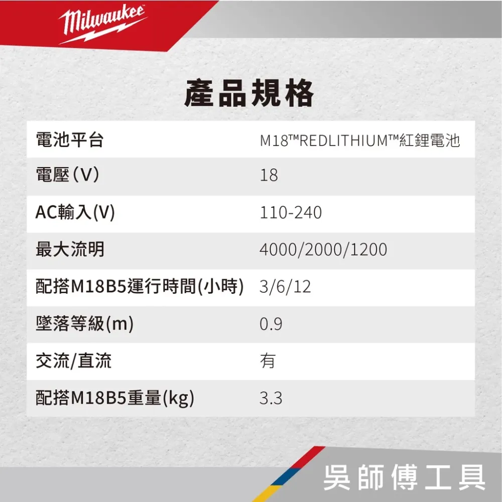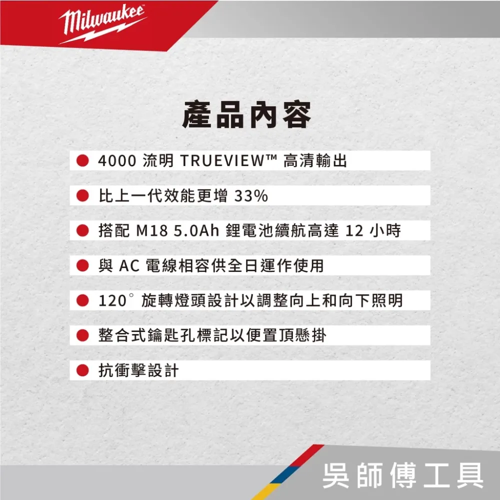 ●搭配 M18 5.0Ah 鋰電池池續航高達 12 小時