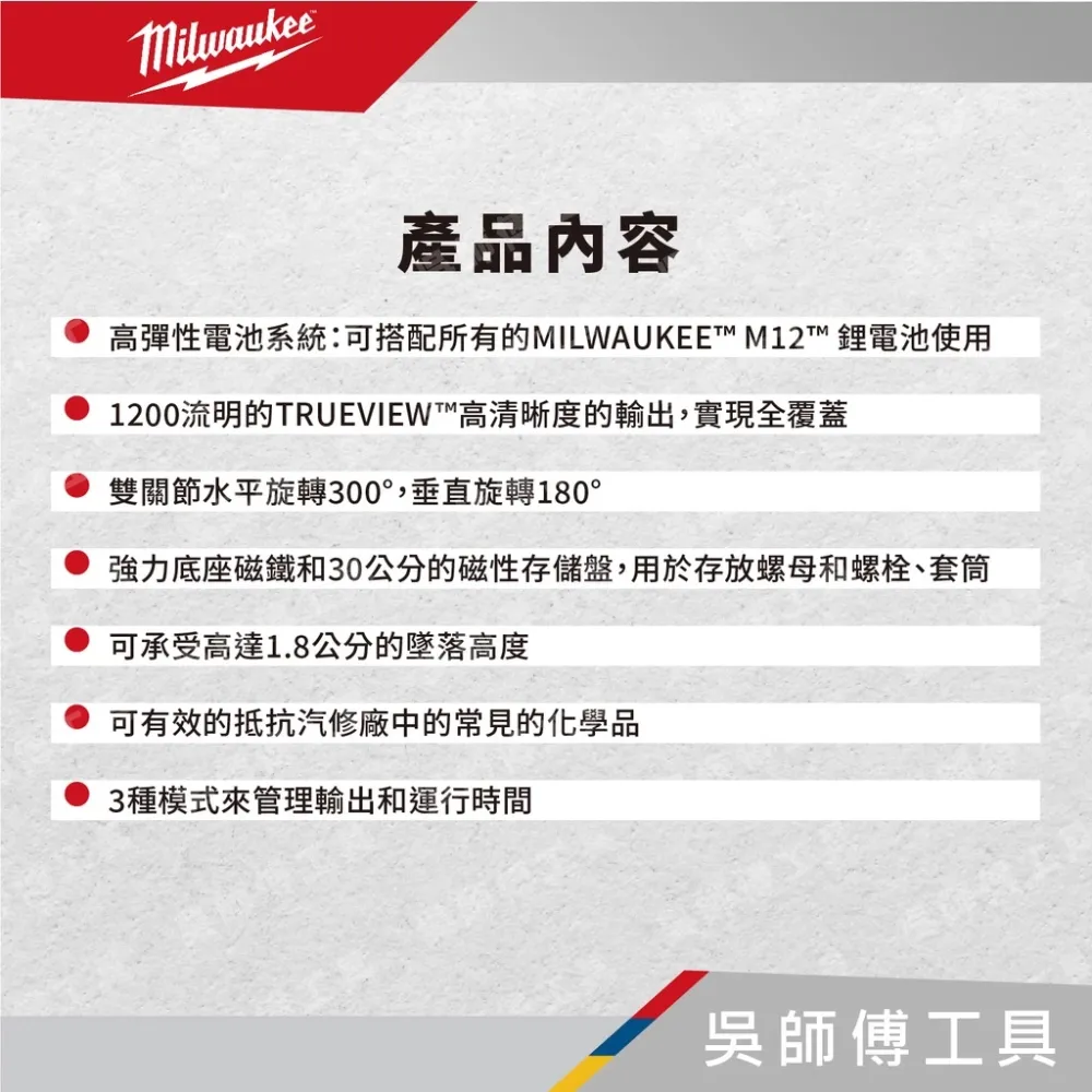 ●使用 M12™ 4.0 Ah 電池可工作長達 15 小時