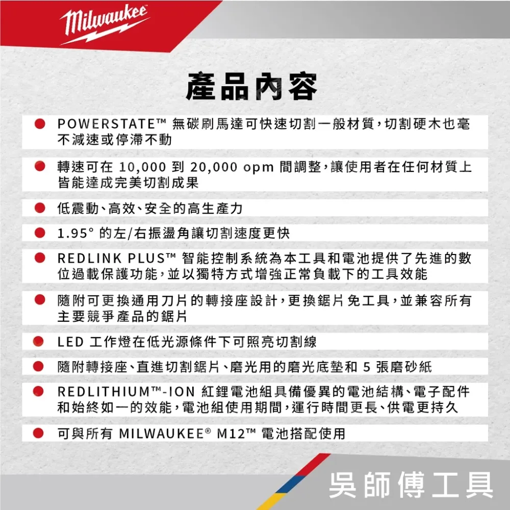 ●無碳刷馬達可快速切割一般材質,切割硬木也毫不減速或停滯不動