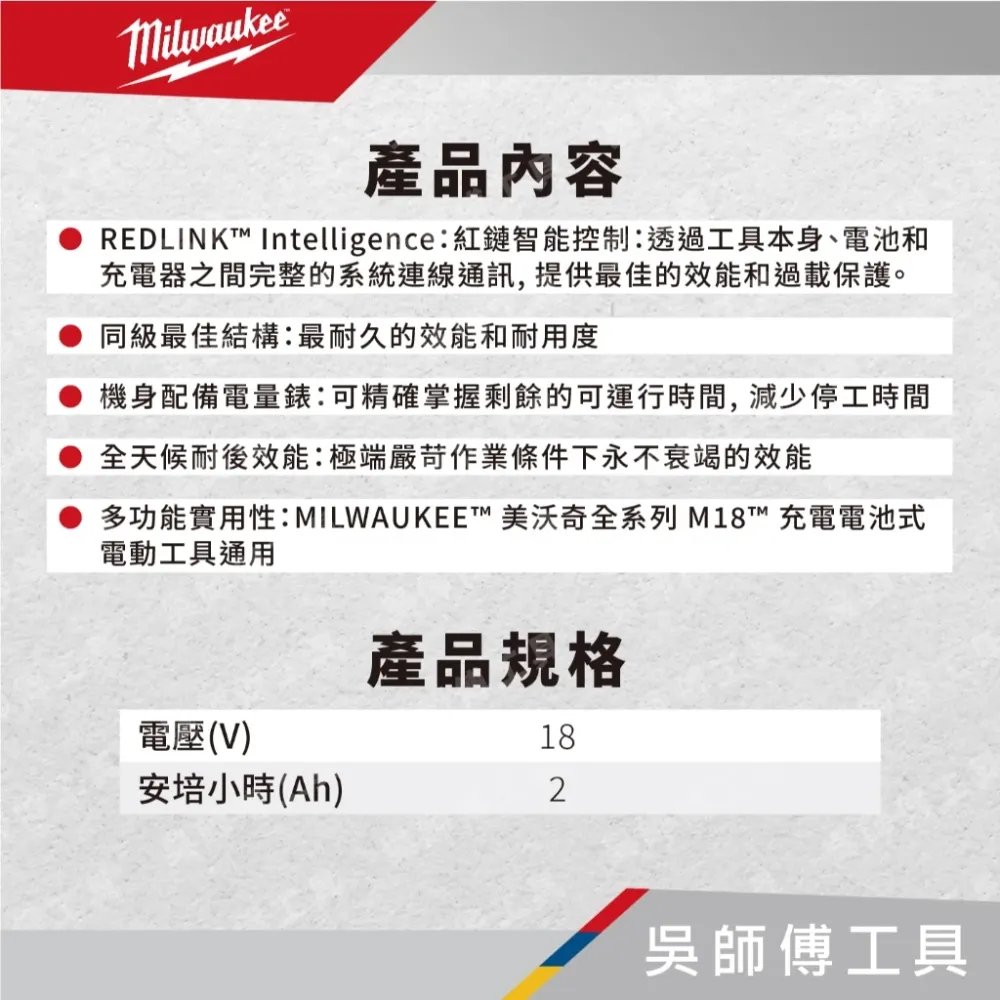 【M18 B2】18V 2.0AH鋰電池