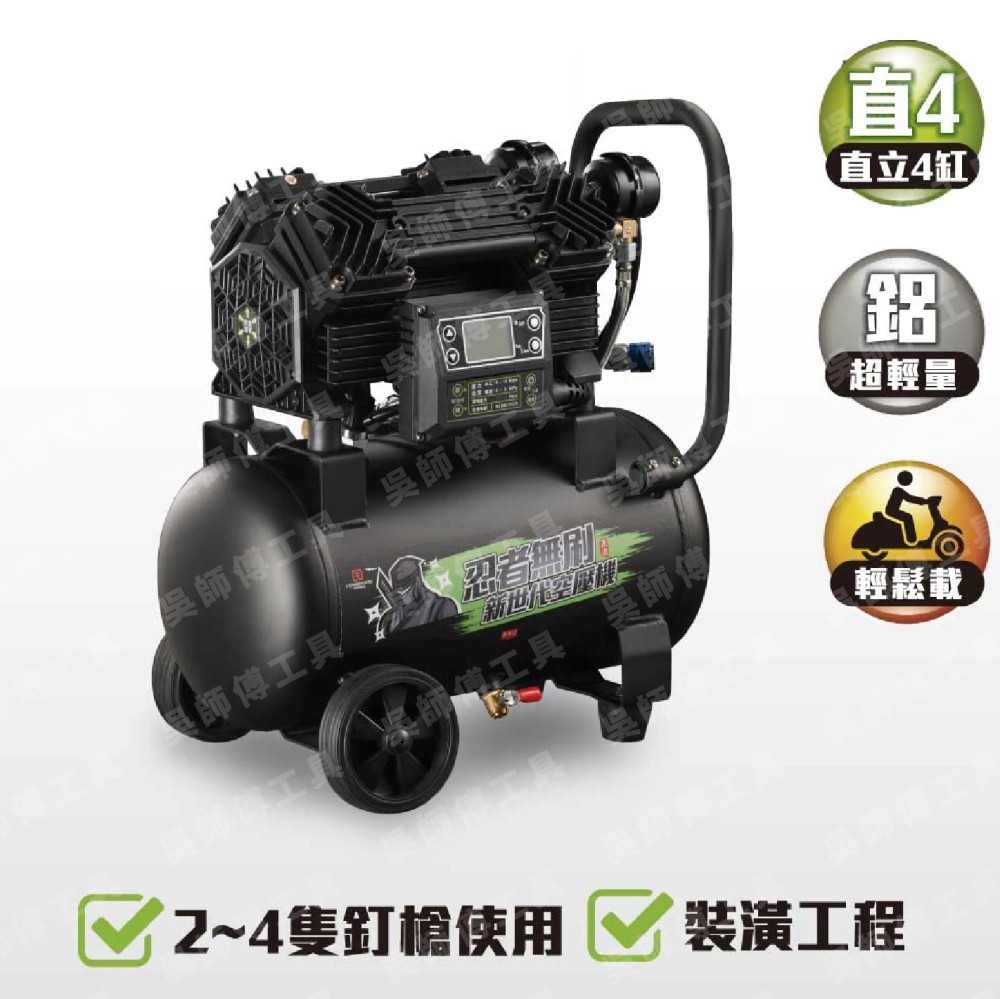新世代忍者無刷空壓機 N-17 是忍者無刷品牌主力機種! 此機配備單一四缸無刷變頻主機,打氣速度快勝傳統3馬半傳統機,重量只有16公斤,木工、公園工程專用附件。