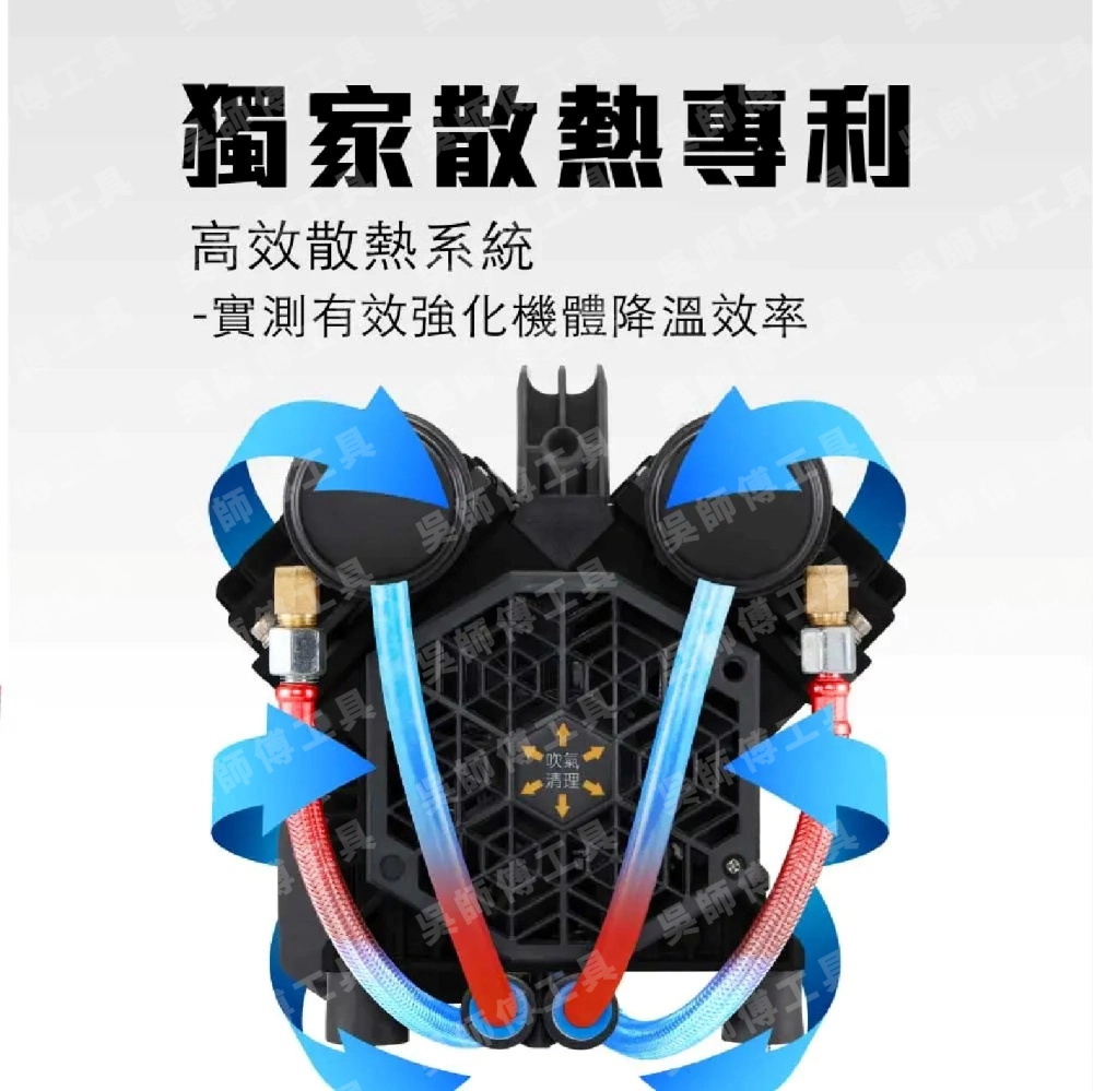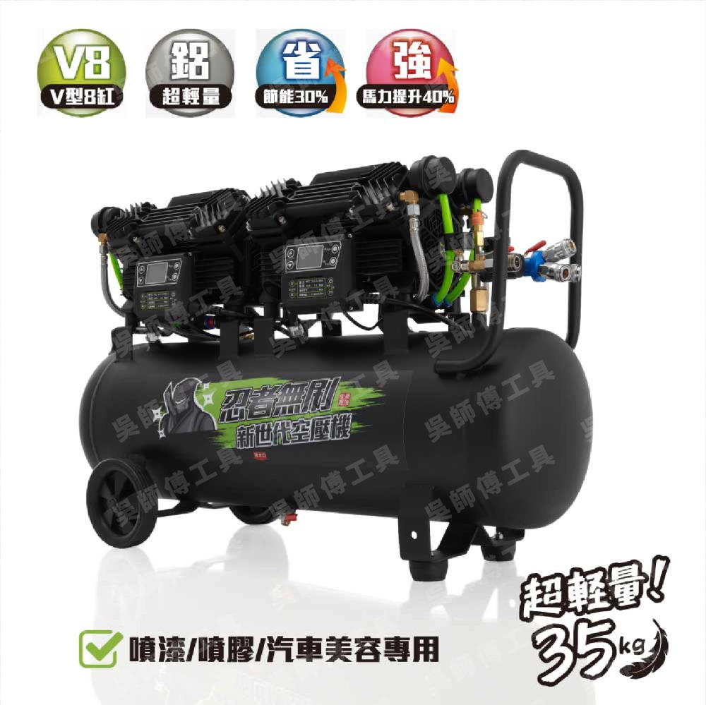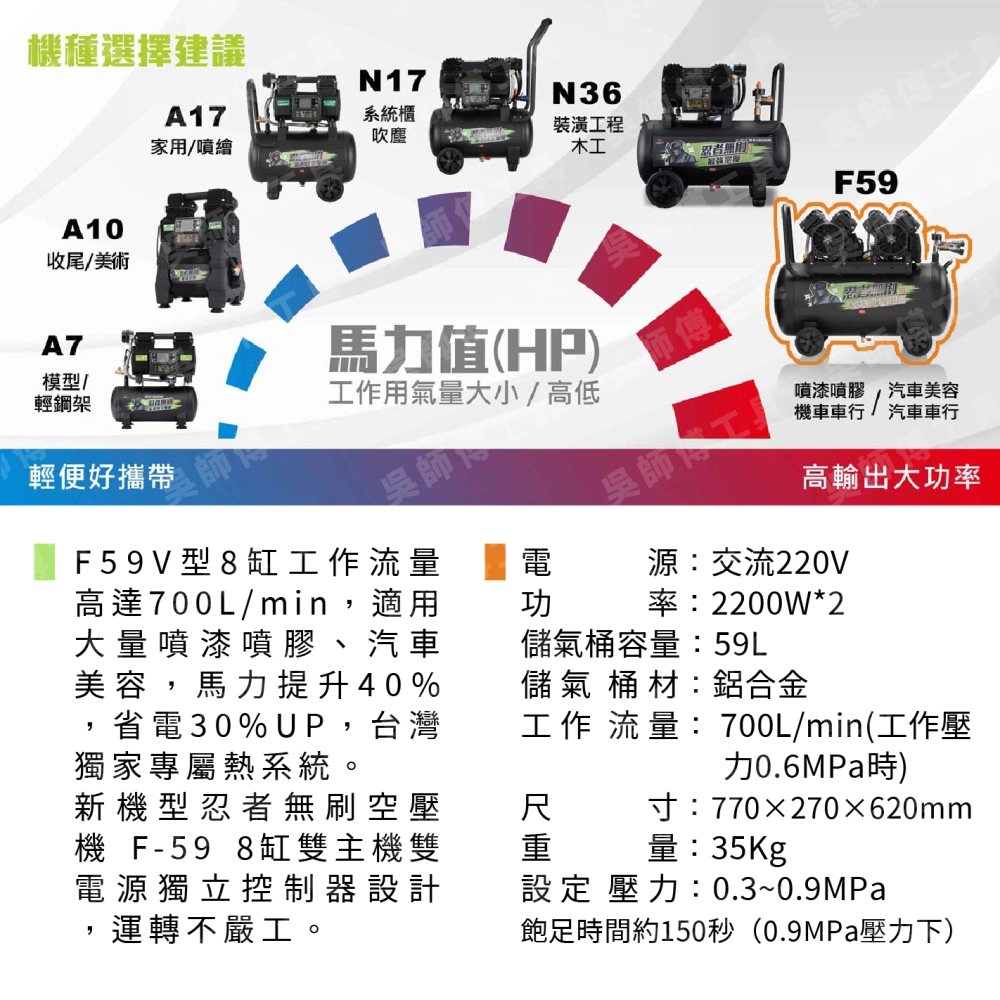 F59V型8缸工作流量高達700L/min,適用大量噴漆噴膠、汽車美容,馬力提升40%,省電30%UP,台灣獨家專屬熱系統。