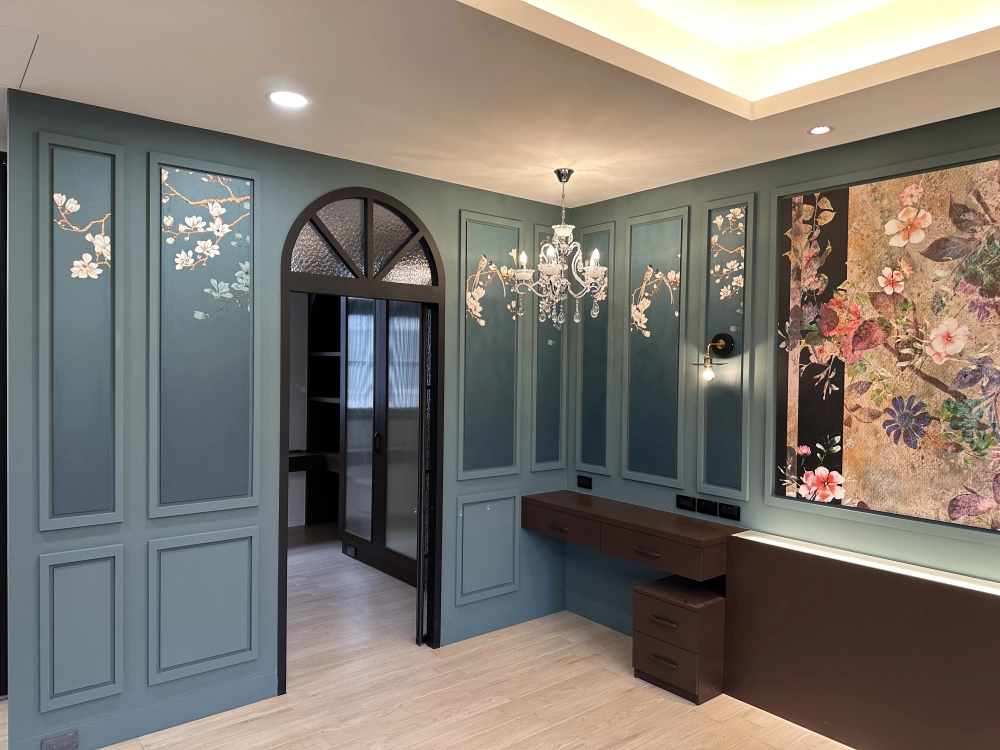 墨綠或藍綠色跳色牆面搭配古典線板,油漆分色與收邊俐落,彰顯精緻感。