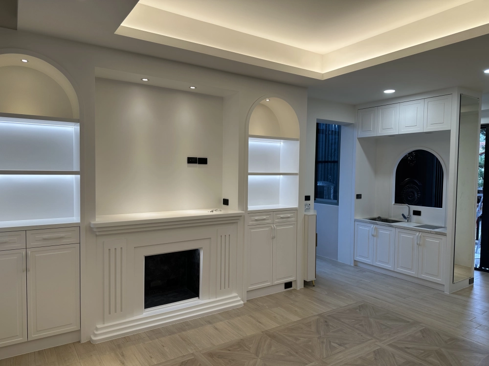 精準打造客廳壁爐式電視櫃,搭配兩側圓弧拱門展示櫃,線板平整對稱,呈現古典優雅感。