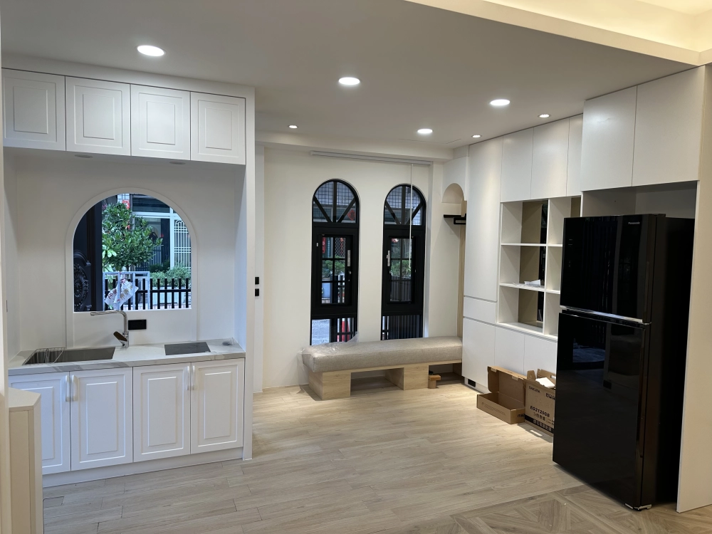 延續拱門設計語彙,玄關長椅與掛衣區、廚房中島拱門窗皆成為視覺焦點。