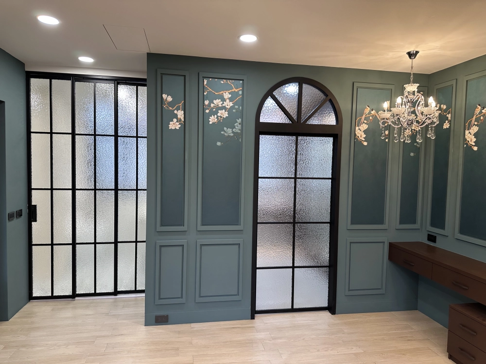 黑色拱門玻璃門及鐵件玻璃推拉門,既界定空間,又增添復古戲劇感。