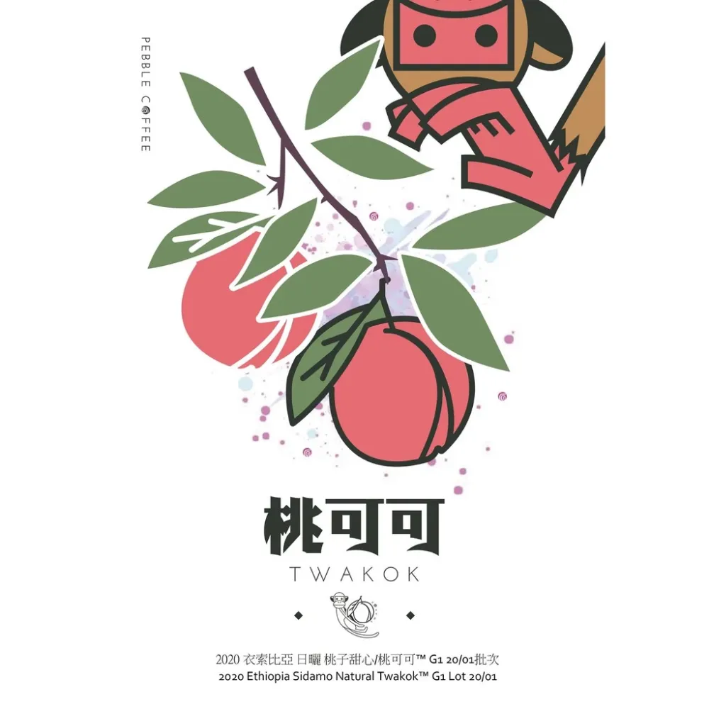 Twakok在衣索比亞的原文為 Tafac Kok。Tafac是甜蜜的意思,Kok則是水蜜桃,合起來就是甜蜜的水蜜桃,我們在杯測到這支豆子的樣品時,被其甜蜜的桃子風味所深深吸引,因此將其命名為桃子甜心,並請教衣索比亞的朋友,將桃子甜心以衣索比亞的原文詮釋,略加轉換後命名為 Twakok,中文譯名為桃可可,恰如其分的表現其甜蜜感十足的蜜桃可人風味。
