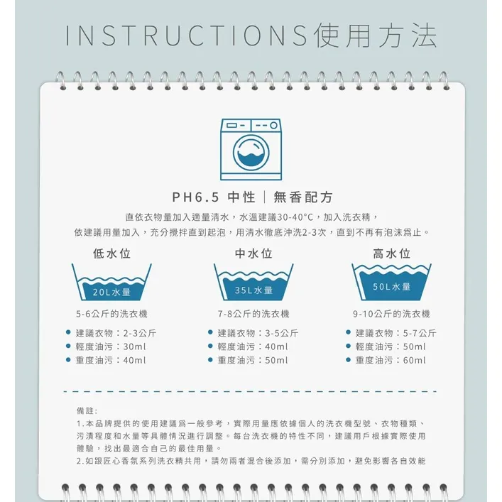PS : 本品牌提供的使用建議為一般參考,實際用量應依據個人洗衣機型號、衣物種類、污漬程度和水量等具 體情況進行調整每台洗衣機的特性不同,建議用戶根據實際使用體驗,找出最適合自己的最佳用量。