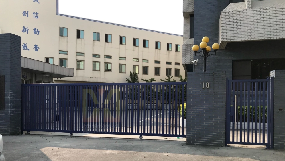 科技上市公司大門,採用深藍色金屬橫拉門設計,細緻直條欄杆拉出長達一整排的水平視覺,