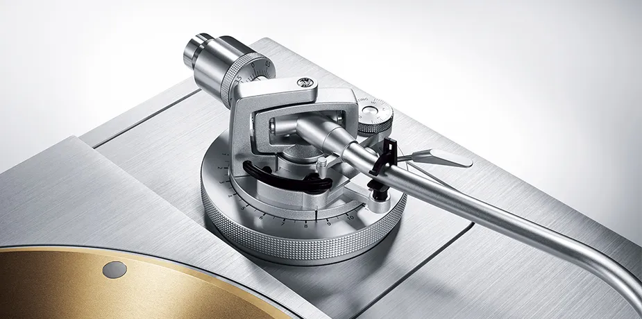 連接到SL-1000R的音臂繼承了Technics傳統上採用的靜態平衡型通用S形音臂。通過將臂有效長度(從音臂旋轉軸到針尖的距離)設置為254mm,跟踪誤差減小並且讀取精度得到改善。採用重量輕,阻尼特性高的鎂管作為音臂管的材料。此外,萬向懸架結構的音臂軸承部分採用高精度軸承。通過熟練的日本工匠的手組裝和調整這些,我們實現了高初始靈敏度。此外,音臂的高度調節寬度從0增加到15毫米,可以容納更多的音箱。