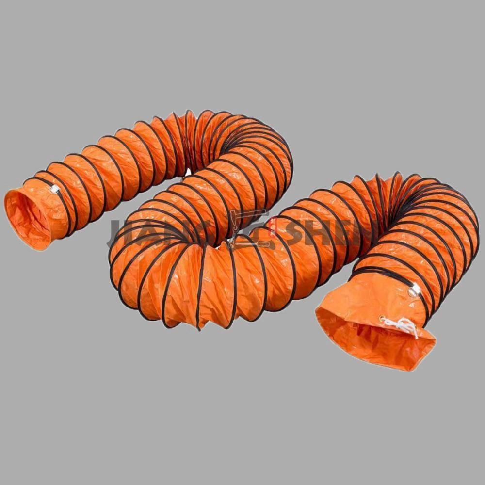 結構:風管由螺旋鋼絲支撐,鋼絲用黑色橡膠條包裹,耐磨損。一端喇叭口帶繩子,另一端帶金屬圈,每個單獨的風管可以很容易地連接在一起。