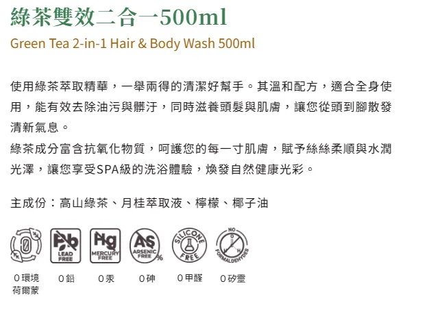 選用天然綠茶精華,一舉兩得的清潔好幫手。其溫和配方,適合全身使用,能有效去除油污與髒汙,同時滋養