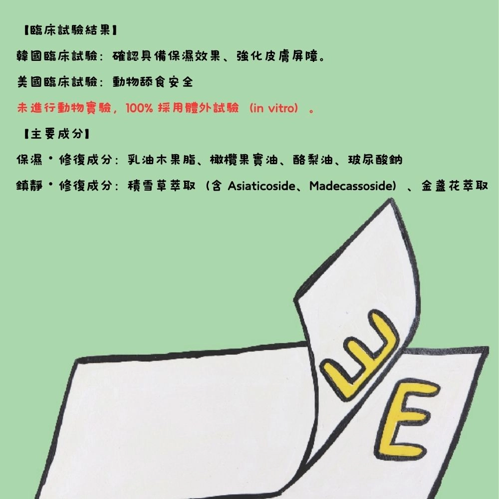 成分:水,鯨蠟硬脂醇,乳油木果,1-二十烷醇,二十二烷醇,花生醇葡糖苷,甘油,油橄欖果油,葡萄籽油,甘油硬脂酸酯,積雪草苷,羥基積雪草苷,糊精,海水,丁二醇,溶菌酶,1,2-己二醇,酪梨油,金盞花花提取物,黃柏提取物,山梨醇硬脂酸酯,山梨糖醇酐倍半油酸酯,玻尿酸鈉,黃原膠,甘草酸二鉀,維生素E,乙二胺四乙酸二钠,精胺酸,對羥基苯乙酮