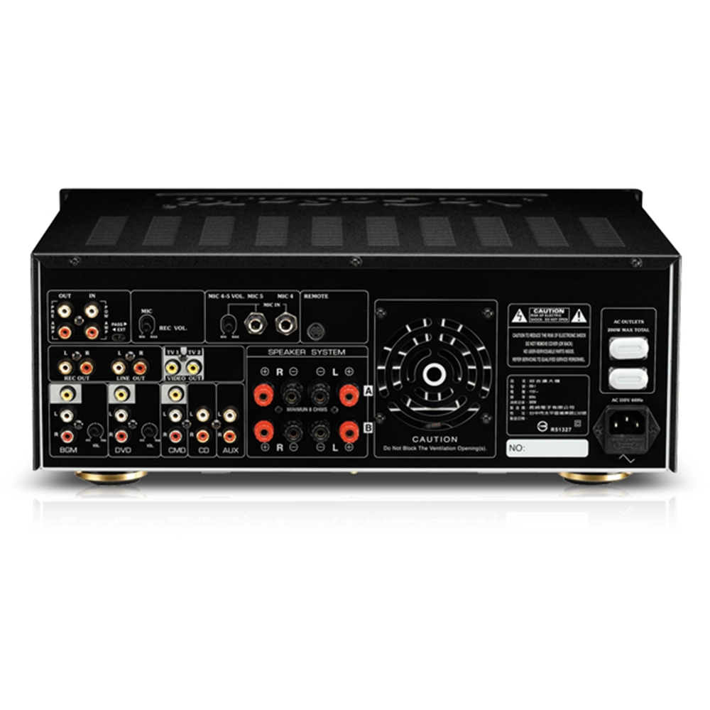 全功能遙控器,可控制音樂、麥克風、音量、靜音、 響度增加、音聲多重、自動接唱、喇叭A組.B組選擇。