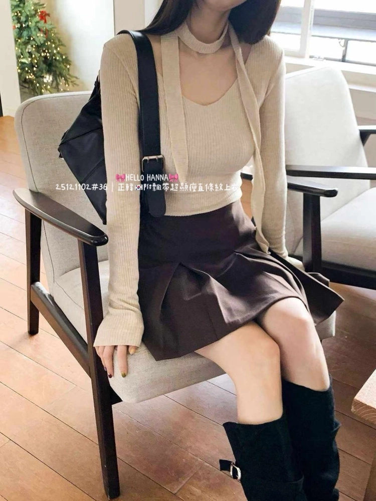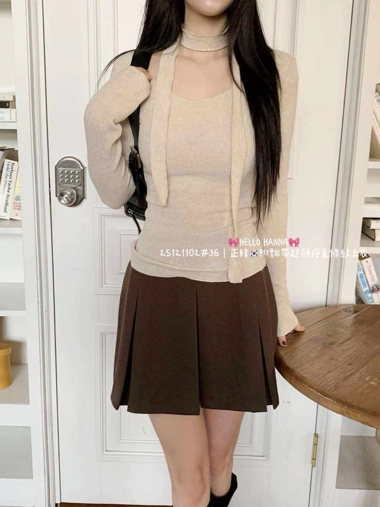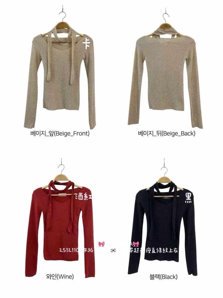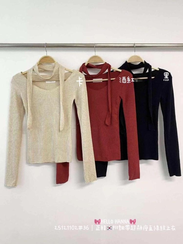 • 正韓附飄帶超顯瘦直條紋上衣