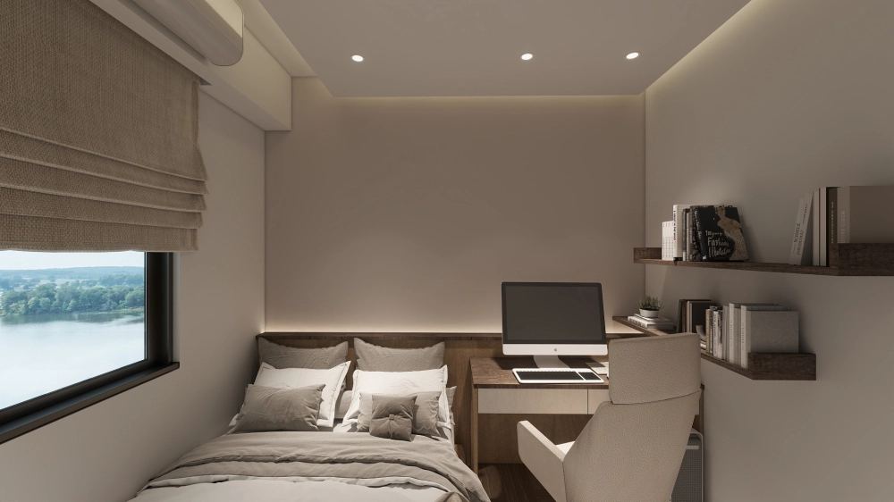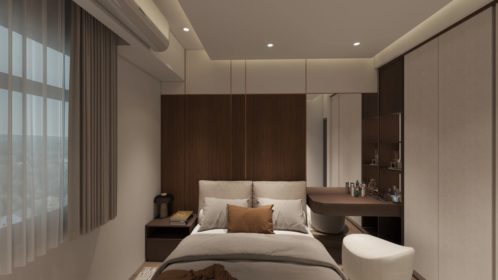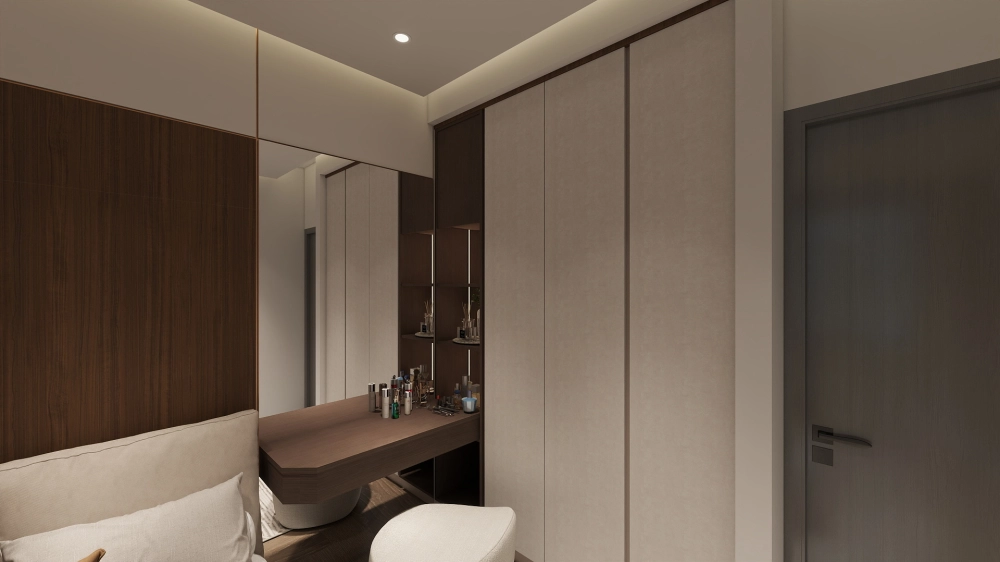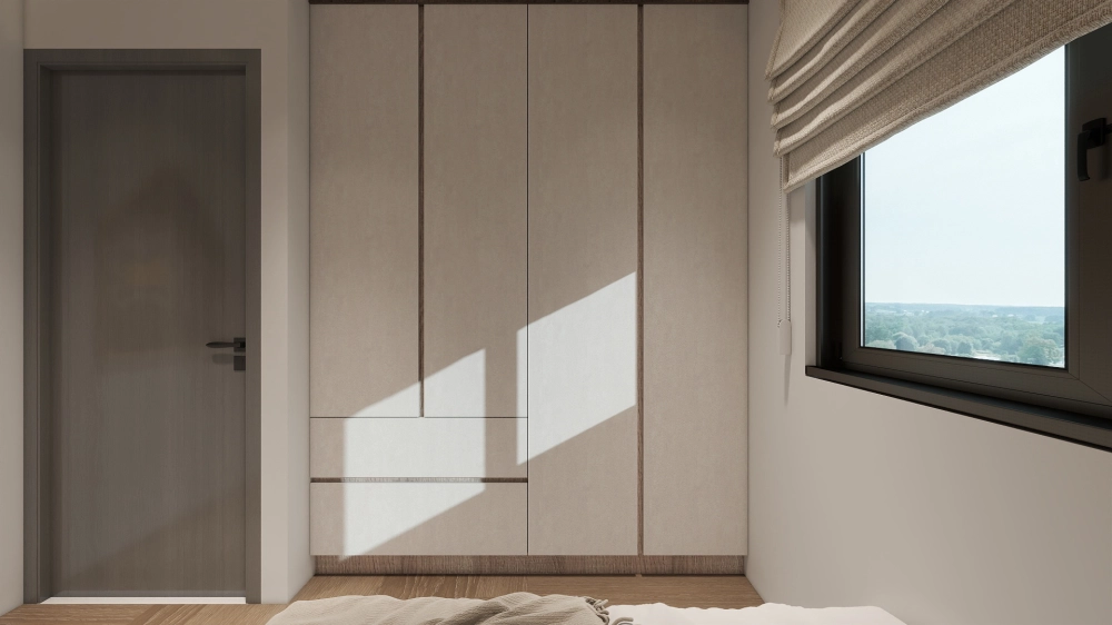 兩房配置避免過度堆疊收納,而是依照實際生活需求調整櫃體尺度,讓動線保持順暢,空間不被櫃量壓縮。