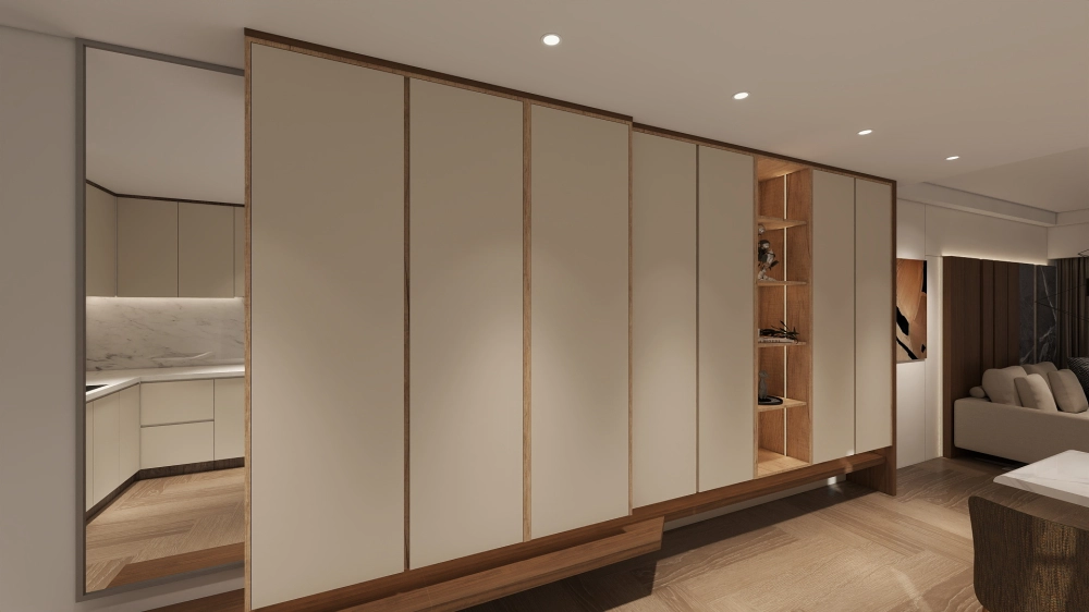 貼鏡並非單純為了效果,而是作為小坪數中「不增加體量、卻能擴展感受」的設計手法,讓空間顯得更輕盈。