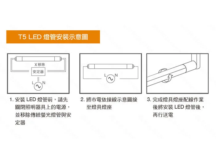 5. 不需要安定器,故需搭配無安定器的LED T5支架燈具