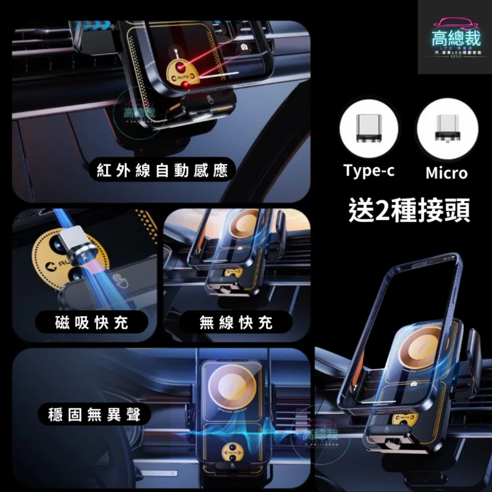• 車用無線充電手機架 LED氛圍燈 全自動開合 車用手機架 無線充電手機架 汽車手機架 手機架 導航支架 車用無線充電
