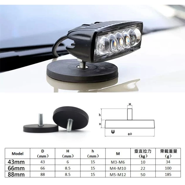 • 【高總裁LED 】台灣現貨 外螺紋包膠磁鐵 88/66/43mm 強力磁鐵附螺帽 LED長條燈底座 車頂燈固定 磁鐵支架