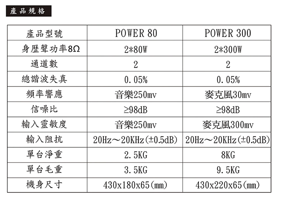 身歷聲功率8Ω: 2 x 300w通道数: 2