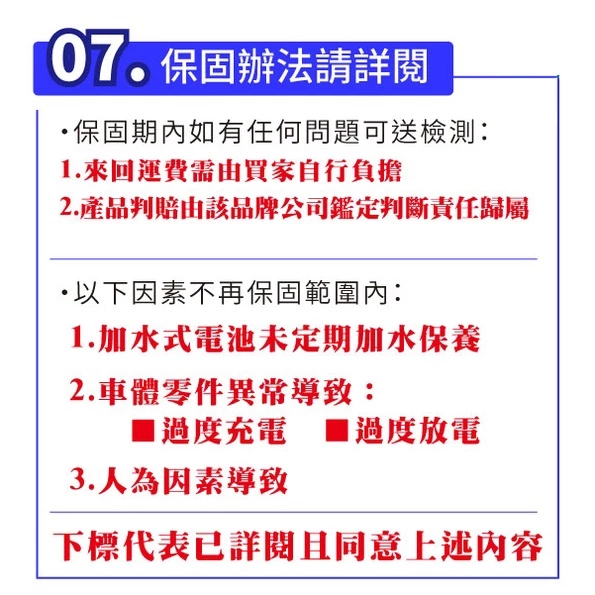 6.加水式電池如未定期加水保養、過度充電或電池過度放電敝賣場一概不負之責。