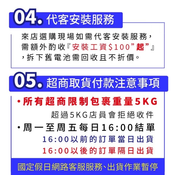 ■ 如需代客安裝服務,需額外酌收『安裝工資$100起』,拆下舊電池需回收且不折價