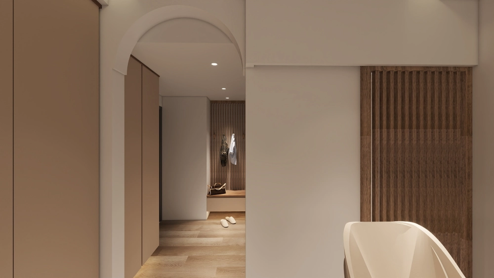 弧型天花柔化了空間的邊界,讓氛圍更顯親切;木格柵的光影流動,則為日常增添一份靜謐的陪伴。