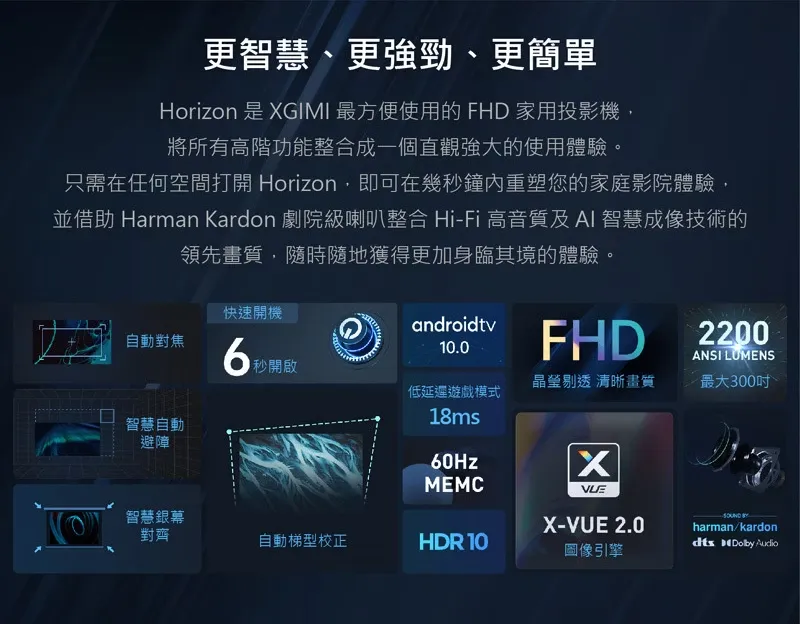 | 特色 | 顯像支援:HDR 10、MEMC動態補償 遊戲模式:18ms 低延遲 圖像引擎:X-VUE 2.0 智慧銀幕對齊、自動梯型校正 智慧自動避障、自動智慧對焦 |