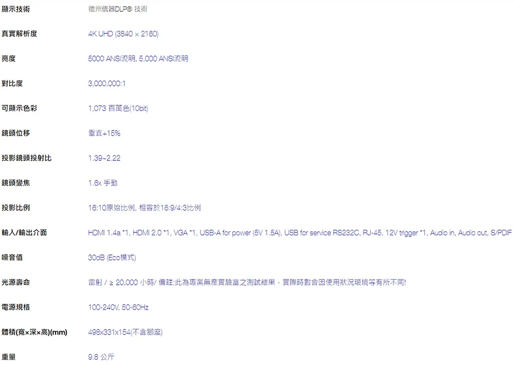 商品BenQ V5010i 4K UHD 2500流明 RGB三原色 雷射家庭劇院投影機