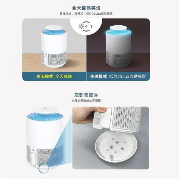 智慧光感應偵測環境光線,低光照時自動開啟捕蚊