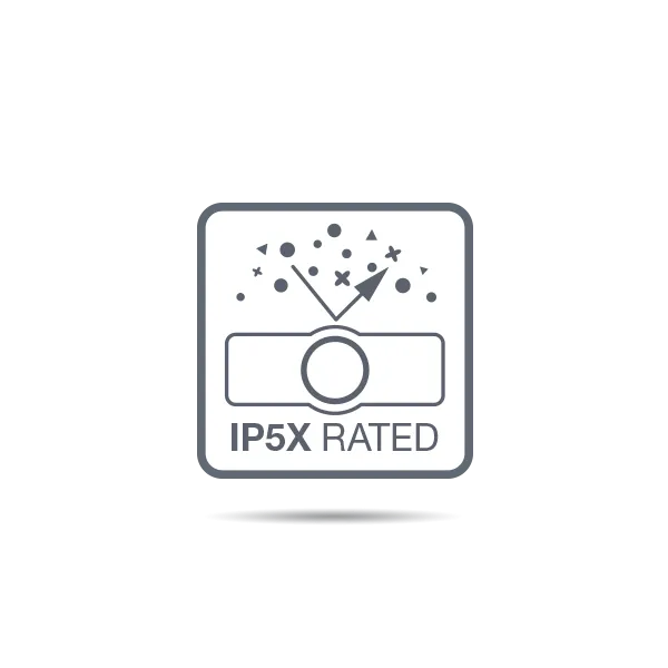 採用Optoma新一代通過 IP5X等級國際防塵認證的密閉式光學引擎,能夠高效阻絕空氣灰塵並且確保長效使用的效能性,免除需經常性維護或更換維修的困擾。