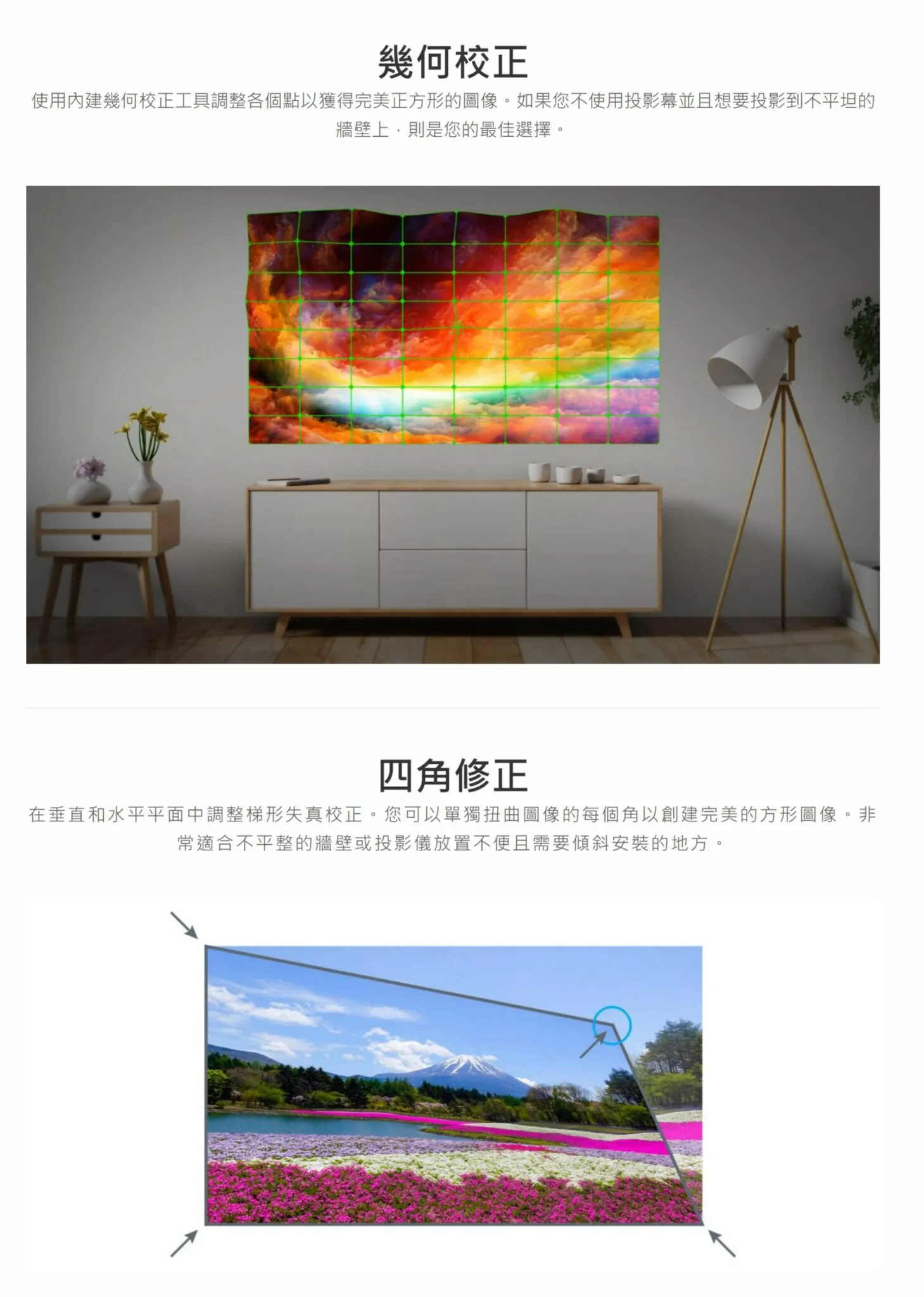 -四角修正和水平/垂直梯形校正,安裝超級便利