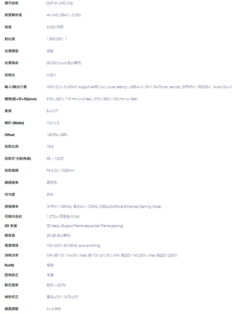 商品BenQ V5010i 4K UHD 2500流明 RGB三原色 雷射家庭劇院投影機