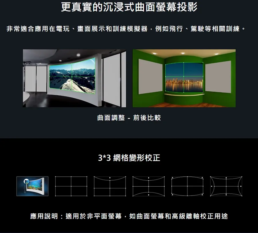 支援 3 x 3 網格曲面調整,更真實的沉浸式曲面螢幕投影