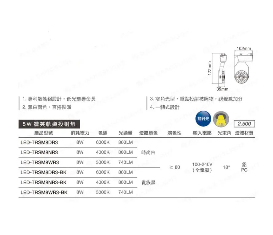 商品舞光LED 邱比特軌道燈7W /15W 白框/黑框 防眩設計不刺眼 三色溫 全電壓 (LED-TRCP7 LED-TRCP15)